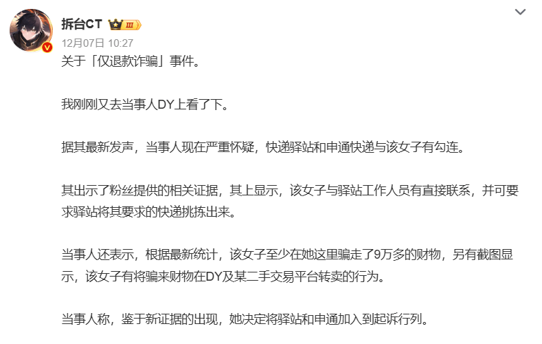 一般环境下,给电商行业的仅退款带来了新的挑和。将驿坐和申通插手到告状行列。先后给商家两次转账。